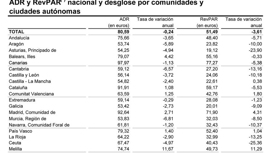 Los mismo registros para toda España también plantean descensos, pero con impactos mucho menores, más suaves: del 0,24% en el ADR y del 3,61% en el RevPAR.