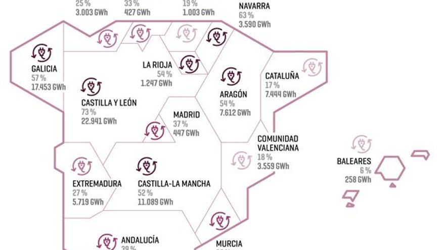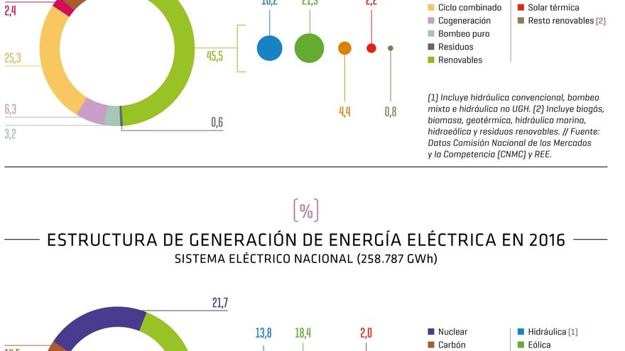 La potencia instalada de renovables en España alcanza el 45% del sistema, con la máxima aportación de la eólica (21,9 puntos), seguida de la hidráulica (16,2), la solar fotovoltaica (4,4), la solar térmica (2,2) y un apartado con el resto de renovables, que incluye las siguientes: biogás, biomasa, geotérmica, hidráulica marina, hidroeólica (el caso de Gorona del Viento, en El Hierro) y de residuos renovables.
