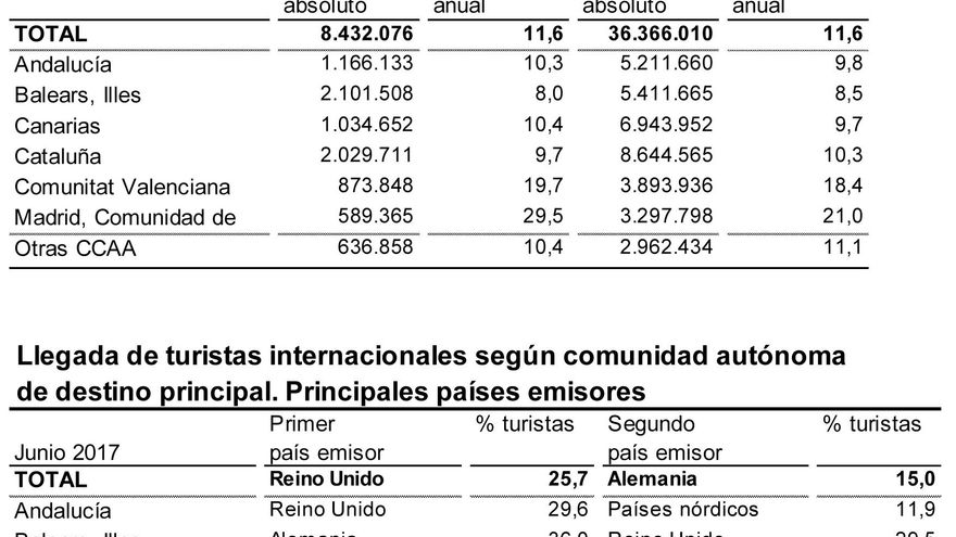Los principales países emisores fueron el Reino Unido, con casi 8,6 millones de turistas y un incremento del 9,1% respecto a los seis primeros meses de 2016; Alemania, con cerca de 5,5 millones y el 9,6% más, y Francia, con más de 4,7 millones y un aumento del 4,9%. Solo en junio, las llegadas de turistas extranjeros repuntaron el 11,6% en todo el país, hasta sumar los 8,4 millones.