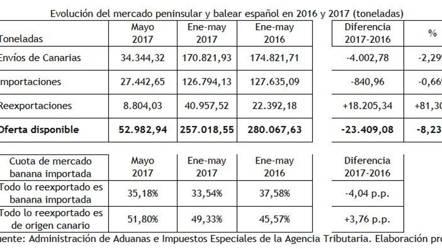 Desde el archipiélago canario se han remitido al mercado ya definido 4.003 toneladas menos en enero-mayo de 2017 respecto al mismo periodo anterior (-2,3%), mientras que la importación de banana mantuvo los mismos niveles (-841 toneladas, -0,7%) y las reexportaciones prácticamente se duplicaron (+18.205 toneladas, +81,3%).
