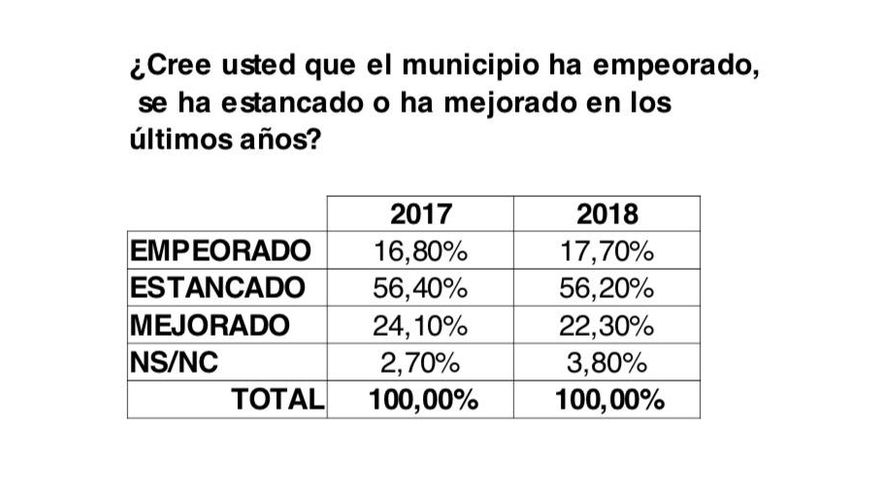 El sondeo al que ha tenido acceso Tenerife Ahora, efectuado entre los días 20 y 23 de septiembre, marca la idea en crecimiento de la necesidad de un cambio de gobierno municipal, en relación a otra encuesta anterior realizada por el mismo equipo en enero de 2017.
