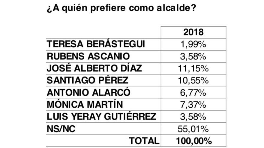 En este último caso, hasta un 55,10% no contesta a la pregunta de a quién quiere al frente de la Alcaldía de San Cristóbal de La Laguna, que gana José Alberto Díaz (CC) con un 11,15%, seguido muy de cerca por Santiago Pérez (XTF-NC) con un 10,55%. El resto de líderes políticos queda a distancia de estos dos: Mónica Martín (PSOE), 7,37%, Antonio Alarcó (PP), 6,77%, Rubens Ascanio (Unidos Se Puede) con un 3,58%, y más descolgada, Teresa Berástegui (Ciudadanos), con un 1,99%.
