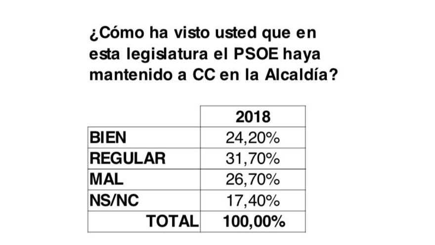 Esa percepción negativa se traduce también en el apoyo de tres de los cinco ediles que el PSOE obtuvo en 2015 (dos bajo la disciplina socialista y uno expulsado) a la Alcaldía de José Alberto Díaz. Casi 6 de cada 10 sondeados y que son simpatizantes socialistas, un 58,4%, ve regular o mal ese pacto CC-PSOE. Solo una cuarta parte de los que dicen simpatizar con el PSOE (24,20%) ve bien gobernar con CC.