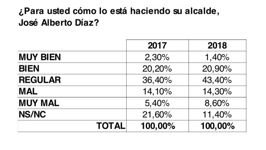 En el sondeo, el alcalde no sale muy bien parado, ya que casi uno de cada cuatro laguneros considera que lo está haciendo mal (14,30%) o muy mal (8,60%), unas cifras que han experimentado un aumento con respecto a las de 2017, como en el caso de los ciudadanos que creen que la labor de Díaz es regular (43,40%). Un 20% de los encuestados dice que lo está haciendo bien, prácticamente como en 2017.