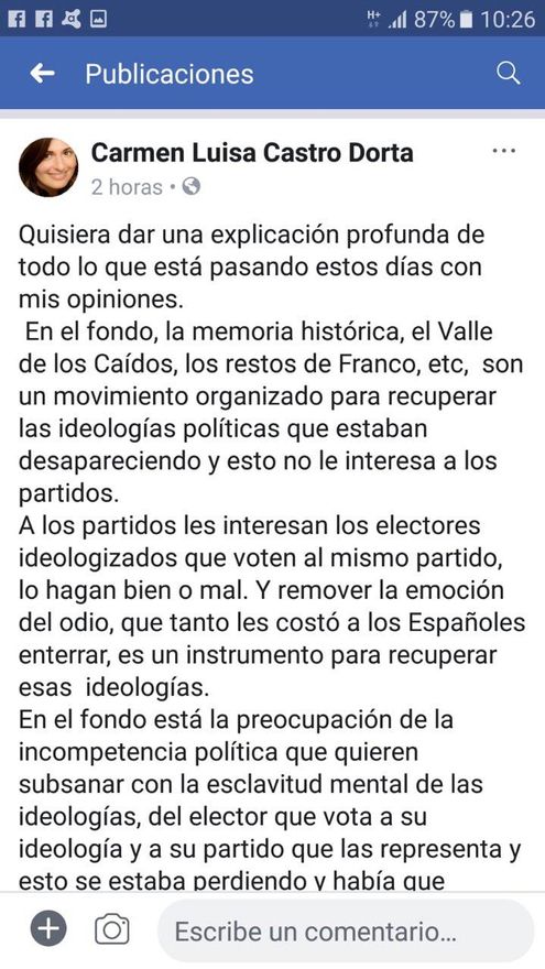 En los párrafos de cosecha propia, Castro sostiene que la decisión del Gobierno socialista de exhumar los restos de Franco para trasladarlos Valle de los Caídos y, todo el proceso de la recuperación de la memoria histórica con el que a su juicio se pretende “remover la emoción del odio”, “son un movimiento organizado para recuperar las ideologías políticas que estaban desapareciendo y esto no le interesa a los partidos” para tener “electores ideologizados”.