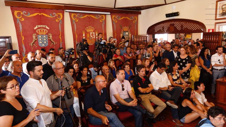 En la sala, el partido perdedor parece que concedió algunas ventajas a los suyos: puestos de privilegio en la primera línea de asientos, incluso reservados antes de la apertura de la estancia, en torno a las 11.00, y botellines de agua solo para los concejales de CC y la secretaria accidental. Hasta el agua se le negó a toda la concurrencia. Luego, gente y más gente: dentro de la sala, con dominio de la bulla de los afines a CC; en el pasillo que daba acceso a aquella, y en la plaza colindante. Había gente por todos lados; también policías locales, pero, y esta es la verdad, no pasó nada: la bronca limitada esta vez no se levantó a modo de mar brava.