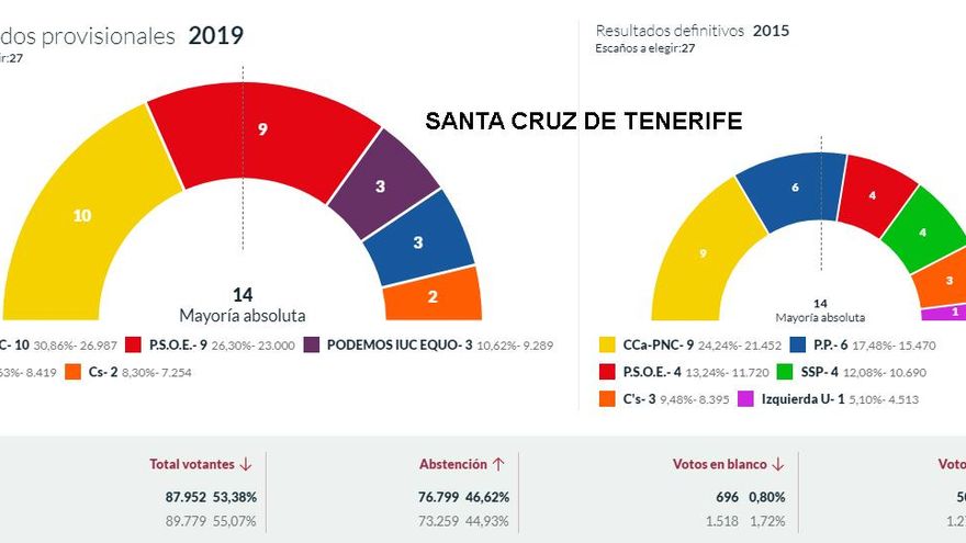 La victoria de la candidata socialista en el pleno constituyente de la Corporación santacrucera ha sido posible gracias a los apoyos de fuerzas dispares: de Ciudadanos y Unidas Podemos, lo que dio a Hernández 14 votos y la mayoría absoluta en el pleno constituyente. Los tres concejales del PP votaron a su candidato: Guillermo Díaz Guerra.