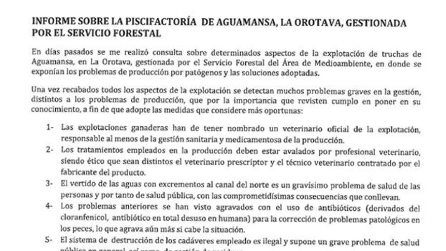 En el acta de Salud Pública se habla del vertido del agua de las truchas sin filtrar ni depurar y sin autorización administrativa, que es preceptiva en este caso, al canal del norte, uno destinado al suministro a humanos, y se alude a la escasez de controles en los tratamientos, aparte de darse a conocer que lo que prescribió el veterinario del proveedor de los piensos corregidos (con los antibióticos) para la enfermedad de las truchas lo hizo hace ya algunos años, en 2014, según lo que constató el inspector en Aguamansa.