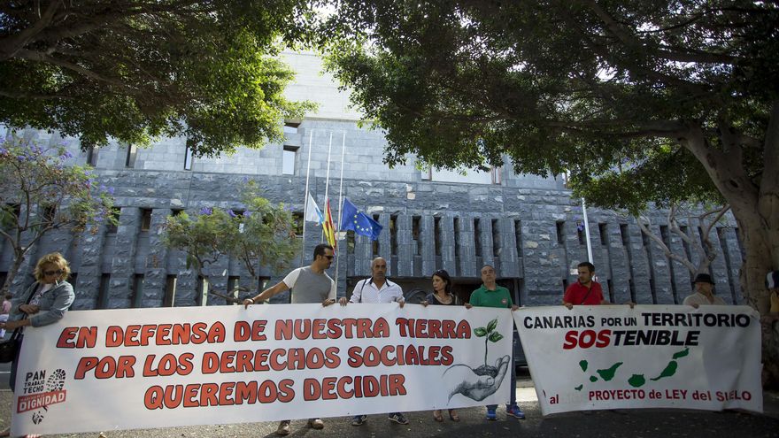 Los diferentes colectivos ciudadanos que conforman la plataforma Canarias por un Territorio Sostenible se han manifestado este miércoles en contra de la futura Ley del Suelo, entre otras reivindicaciones, junto al edificio de Presidencia del Gobierno regional en Santa Cruz de Tenerife, donde un portavoz de ese colectivo leyó un escrito que reclama condiciones de vida dignas y mejores servicios sociales en las islas. Esta acción de protesta se enmarca dentro de la convocatoria de la marcha por la dignidad.