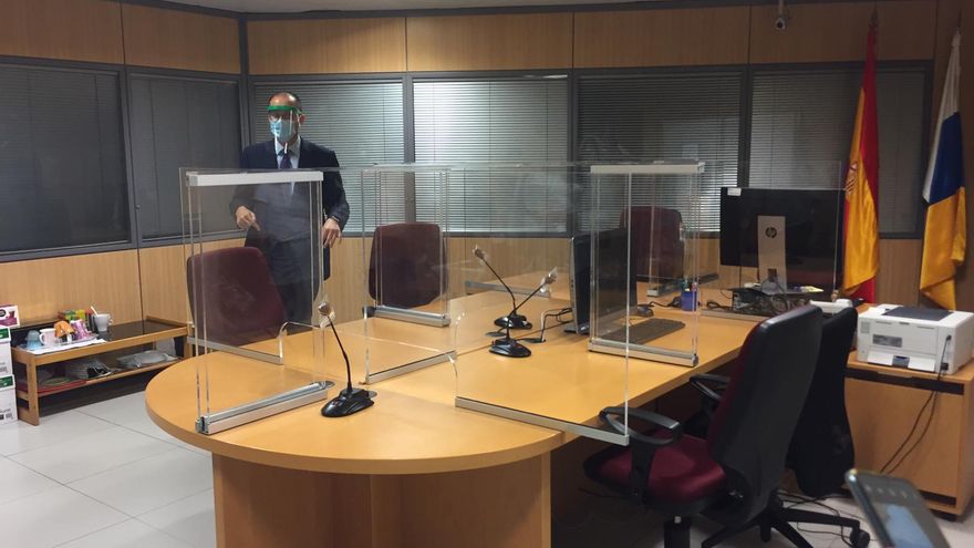 La reducción del aforo en las salas choca con el carácter público de las actuaciones orales. El Real Decreto-ley plantea que debe limitarse el acceso atendiendo a las características de las salas de vistas, manteniendo las distancias de seguridad, evitando las aglomeraciones y el trasiego de personas cuando no resulte imprescindible. En la sala del Juzgado de Primera Instancia número 2 de Arrecife apenas han quedado seis sillas para público. “Las personas que quieran asistir deben avisar con tres días de antelación”, explica De la Cruz. En el caso de los medios de comunicación, el juez decano asegura que está gestándose un protocolo específico.