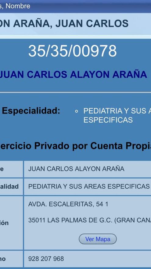 Juan Carlos Alayón figura en el Colegio de Médicos de Las Palmas con el número 978 bajo la especialidad de “Pediatría y sus áreas específicas”, lo que le faculta para atender cualquier tipo de dolencia en personas menores de 14 años. Bajo esa especialidad pasa consulta privada en la avenida de Escaleritas y como médico contratado en el hospital San Roque, de Las Palmas de Gran Canaria. En el servicio de cita previa de este centro privado confirmaron este miércoles a Canarias Ahora que el doctor Alayón solo pasa consultas de Pediatría.