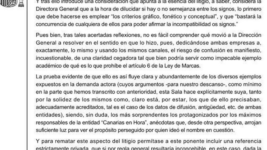 El magistrado remata la sentencia con una “referencia estrictamente privada”, ya que además de ponente también es “público, en la acepción que esta locución tiene en la repetida Ley de Marcas”. Y dice: “El autor de esta ocurrencia ha vivido siempre, desde que nació, en las Islas Canarias. Sabe perfectamente qué es ”Canarias Ahora“ y a qué se dedica. Sin embargo, supo de la existencia de ”Canarias En Hora“ hace unos días: Cuando dio inicio al estudio de este recurso contencioso-administrativo”.
