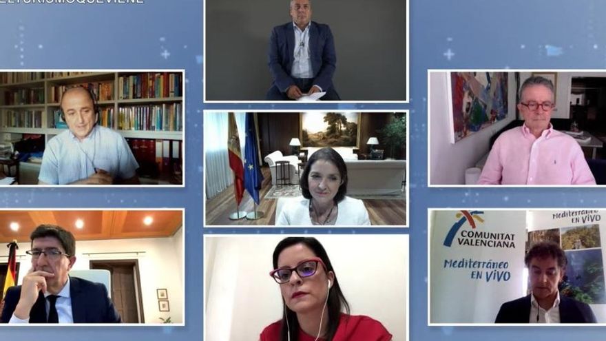 En este encuentro online han participado Reyes Maroto, ministra de Industria, Comercio y Turismo; Juan Marín, vicepresidente y consejero de Turismo y Justicia de la Junta de Andalucía; Yaiza Castilla, consejera de Industria, Comercio y Turismo de Canarias; Francesc Colomer, secretario autonómico de la Gerencia de Turismo de la Generalitat Valenciana; Miguel Sebastián, economista y exministro de Turismo, y Antonio Catalán, empresario, presidente de AC Hoteles.