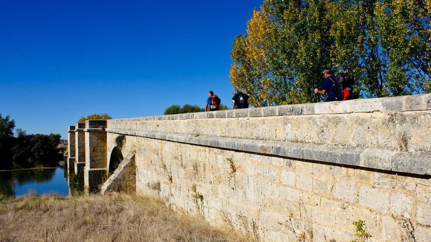 Lejos ya de Burgos, el Camino sigue internándose en lo más profundo y auténtico de la tierra castellana. Jornada difícil marcada por los campos yermos de una Castilla que empieza a hacerse cada vez más austera y sencilla. Entre las dos grandes ciudades mesetarias de la ruta del Franco (Burgos y León) median los impresionantes páramos de Palencia, provincia que alcanzaremos durante el día para dejar atrás las tierras burgalesas. El Puente Fitero, con sus once arcadas medievales de sólidas rocas pardas, salva el cauce del Río Pisuerga y mete al peregrino en la austeridad de Palencia. Rectas interminables, andaderos a la vera de la carretera y la humildad belleza de pueblos en los que el adobe toma el protagonismo de la piedra son la tónica de las jornadas que transcurren por los campos palentinos.