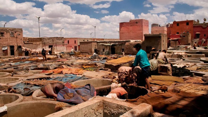 El otro punto de interés al norte de la Jemaá El Fna es el barrio de los curtidores, situado en el extremo noroccidental de la medina y junto al lienzo de murallas que culminan en Bab Debbagh, una de las puertas monumentales de las murallas de la ciudad. Aquí será difícil librarte de algún guía improvisado que quiera enseñarte la mejor tenería del mundo mundial y después embaucarte para meterte en una tienda de cueros o alfombras; pero es parte del folclore del lugar y la recompensa es ver de cerca el proceso de curtimbre de los cueros, que se sigue haciendo como hace siglos usando productos de fuerte impacto olfativo como los excrementos de paloma o los orines de vaca. No son tan impresionantes como las curtidurías de Fez, pero también impresionan. Y del mal olor no te asustes; no es tanto como dicen…
