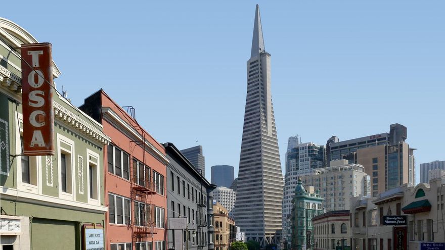 Desde lo alto del Transamerica Pyramid Center (Montgomery Street, 600) las vistas sobre la bahía no difieren demasiado de la de otras ciudades norteamericanas. Los techos de los rascacielos cercanos forman un verdadero bosque de acero, hormigón y cristal que apenas deja ver lo que pasa a nivel de calle. El Distrito Financiero de San Francisco repite los esquemas de los, para nosotros, insípidos y repetitivos downtowns anglosajones; esto no es ni New York, ni la espectacular Chicago. Pero hay que pasarse por aquí, porque una visita a la ciudad sin callejear entre sus gigantes no estaría completa. El Transamerica es el icono arquitectónico por antonomasia de esta parte de la ciudad. Sus 260 metros lo convirtieron en el edificio más alto al oeste de Chicago hasta 1972, cuando cedió este trono simbólico a uno de los rascacielos de Los Ángeles. Subir hasta su mirador es otro de los hitos obligados de un viaje hasta estos lares. Y aún más por su ubicación de frontera. Al sur todo el Distrito Financiero; como una isla entre las colinas cuajadas de casas pequeñas de colores y pequeños jardines.