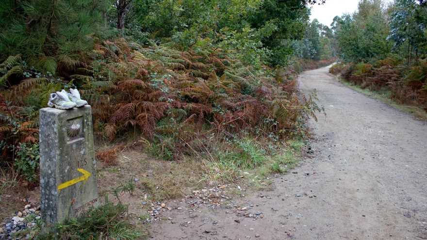 Km. 4 Cimadevilla .- Cimadevilla son un par de casas diseminadas entre prados. Antes de internarse en la masa de eucaliptos conviene parar y echar la vista atrás. Nos despedimos de la Galicia rural que nos ha encantado durante los últimos días. En este momento, el camino de Santiago se convierte en una pista forestal que abandona su trazado original para dar una enorme vuelta que nos ayuda a rodear la pista del Aeropuerto de Santiago de Compostela. Es el tramo más pesado del día. Por eso conviene salir temprano. Si lo hacemos, el amanecer nos sorprenderá subiendo hacia los eucaliptos. El tramo, de 1,5 kilómetros, describe un enorme ángulo recto que, poco después de alcanzar la cabecera de la pista nos sitúa en el límite del Término Municipal de Santiago de Compostela que se anuncia a través de un enorme mojón caminero. Caminamos en paralelo a la autopista A-54 y volvemos a girar 90 grados para buscar el cruce de la pista que nos lleva, picando hacia arriba, hasta la aldea de San Paio (km 7,7). Tomamos una pista que desciende hasta un paso a nivel que nos permite cruzar por abajo la autopista SC-21. Poco después una bifurcación hacia la izquierda nos acerca a Esquipa (Km.9) y, poco después, a Lavacolla.
