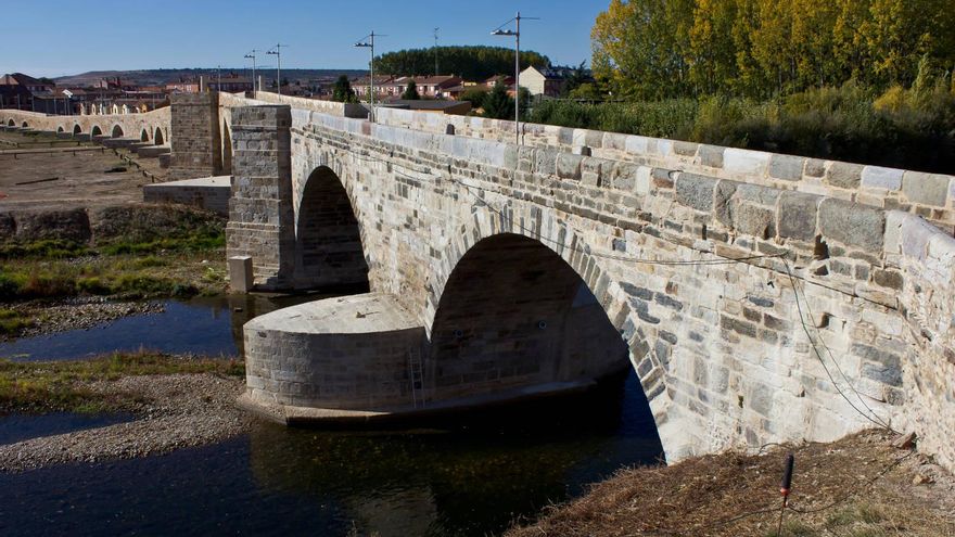 Km. 21,4 Villadangos del Páramo.- Los más observadores se darán cuenta de que el paisaje ya va cambiando hacia el verde. La cercanía del Río Órbigo reverdece las huertas. Aparecen enormes extensiones de chopos que dan sombra y fresquito. Y se agradece. Cómo sucede en otros pueblos castellanos de la ruta jacobea, la N-120 se convierte en Calle al atravesar la población. El camino histórico deja esta ‘avenida’ y cruza Villadangos del Páramo a través de la Calle Real que muere en el Canal de Villadangos, un cauce que nos acompañará durante los próximos kilómetros. Desde la Calle Real seguimos adelante por una pista de tierra sombreada por chopos para volver a la N-120 unos 400 metros después. Y volvemos al andadero. Una recta de casi 4 kilómetros que nos lleva hasta San Martín del Camino, fin de etapa tradicional que nosotros aconsejamos dejar atrás para tener más tiempo para visitar Astorga. Por eso aconsejamos seguir adelante y volver a tomar el andadero de la N-120 por 6,9 kilómetros más. Poco después de salir de San Martín del Camino volvemos al andadero que, durante 5,1 kilómetros transcurre por una recta interminable que queda interrumpida por el cruce con la calle del Paso Honroso. Tomamos este desvío de grava fina que 850 metros después nos deja junto a las primeras casas de Hospital de Órbigo. Llegamos al centro de la localidad tras cruzar el río a través del espectacular Puente del Órbigo, una maravilla de la ingeniería medieval.