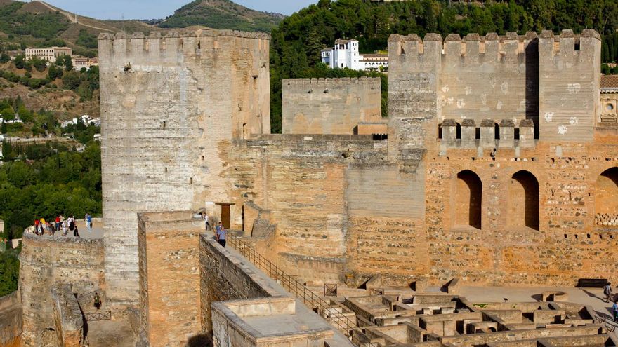 En su interior pueden verse los restos del barrio castrense, lugar de residencia de los soldados y, aún apiladas, numerosas piedras redondeadas preparadas para ser disparadas por las catapultas. Lo más notable del complejo es su impresionante sistema doble de murallas y sus torres que servían para controlar lo que sucedía en la propia ciudad y, como es lógico, poder adelantar la llegada de cualquier amenaza externa. La Torre de La Vela es el elemento más característico de esta parte de La Alhambra. Desde su cima puede verse prácticamente toda la ciudad, la vega granadina y los accesos a Sierra Nevada. En tiempos medievales estaba comunicada con la vecina Sierra Elvira (dónde hay una atalaya fortificada) por un sistema de semáforos elaborados con espejos y planchas de metal pulido y mediante antorchas para adelantar la llegada de cualquier ejército enemigo.