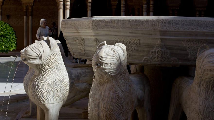 Yeso decíamos. Los artesanos andalusíes se convirtieron en maestros del yeso. Supieron darle vida. Y si hay algún sitio en el que el yeso habla es el Patio de Los Leones; y no sólo en el exterior o en los corredores. Basta con meterse en cualquiera de las salas y mirar hacia arriba para darse cuenta del grado de maestría que se alcanzó en este lugar. Las cúpulas se convierten en verdaderas cavernas cuajadas de estalactitas que forman un conjunto geométrico alucinante en el sólo la introducción de errores voluntarios (para no desafiar la creación de Dios) impiden la perfección más absoluta. No están estos espacios exentos de leyendas e historias; como la del asesinato en masa de los Abencerrajes, caudillos militares que fueron degollados a traición en una de las salas del Patio de Los Leones y cuya sangre, dicen, aún puede intuirse entre los mármoles del suelo. Personajes míticos y reales. Como los propios sultanes; el emperador Carlos V o el escritor Washington Irvin, que escribió sus ‘Cuentos de La Alhambra’ después de vivir un tiempo aquí.