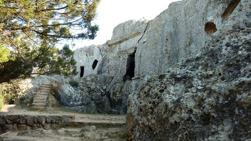 NECRÓPOLIS Y POBLADO DE CALA MORELL .- Es otro de los imprescindibles por su carácter singular y hasta monumental –en el sentido más espectacular del término-. Otra de sus particularidades es que se trata de uno de los escasos ejemplos de la cultura talayótica que se encuentran en la costa norte de la isla. Como otras necrópolis de la isla, la de Cala Morell se encuentra en un cantil cercano a la costa y está formada por cámaras artificiales excavadas en la roca. Lo que sorprende de este enclave es la gran cantidad de hipogeos (catorce) y el tratamiento escultórico de algunas de las portadas que ponen de manifiesto el contacto de la cultura local con las grandes civilizaciones mediterráneas (estuvo en uso desde el 1.600 AC hasta el siglo VI AC). A pocos metros se encuentra la propia cala, que si bien no tiene nada de espectacular en comparación con otras playas de la isla, si es un buen lugar para darse un chapuzón y ponerse las gafas y el tubo (es uno de los lugares con mayor concentración de fauna marina del litoral menorquín). En Punta de Llevant puedes visitar un pequeño poblado talayótico con algunas estructuras de piedra y muros defensivos.