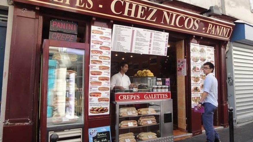 CHEZ NICOS : (Rue Mouffetard, 44; Tel: (+33) 01 4587 2813) Crepes dulces y salados a muy buen precio y, también, riquísimos. El local es chiquito y suele estar empetado, pero es posible comprar para comer en la calle y cierra a las dos de la mañana –otra vez ideal para españoles-. La sencillez del local engaña, porque los crepes son grandes y exquisitos (la variedad es espectacular). No tienen nada que envidiar a los de los locales más caros de la ciudad y aquí puedes comer por muy poco dinero. Un crepe salado (son grandes) y una bebida salen como 10 euros, un precio que en París, sencillamente, no existe. Es una de las visitas recurrentes de nuestros paseos parisinos. Precio Medio: 10 euros.