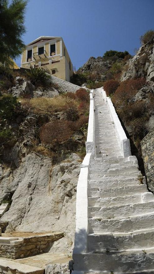 Ano Simi ocupa las cuestas de una ladera en forma de U cerrada que emerge del mar y gana una altura considerable altura en apenas un centenar de metros. Las casas de porte clásico (herencia de los años de presencia otomana) se agarran a la pendiente y se comunican a través de escaleras, cuestas y andenes que forman un abigarrado y pintoresco casco urbano que culmina en los muros del Castillo de los Caballeros de San Juan, huella del paso de los cruzados por la isla. Sólo en los alrededores del puerto, la pendiente nos da un respiro. Aquí están la Iglesia de San Juan y el Museo Arqueológico (Tel: (+30) 2241 071 114) que ocupa una mansión del siglo XIX y cuenta con colecciones centradas en los periodos clásico, romano y bizantino. Otro imprescindible, que es a la vez un reto, es subir los más de 500 escalones de la Kali Strata hasta el barrio de Chora. Allí te encontrarás con preciosas ermitas e iglesias (algunas soberbias como la de La Asunción), restos del castillo cruzado y molinos que miran hacia el mar esperando su viento. Una maravilla.
