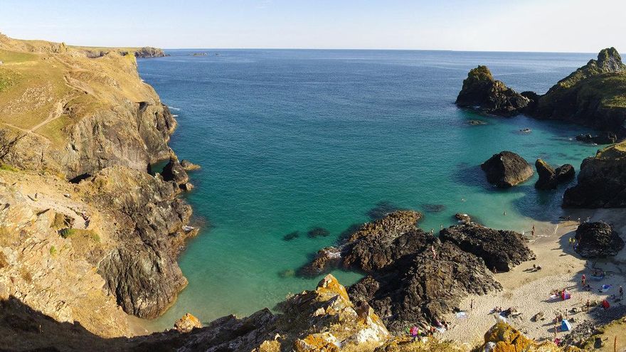 El paisaje de Kynance Cove cambia constantemente al capricho de las mareas; las playas de arena blanquísima aparecen y desaparecen y las peñas se convierten en cabos durante las bajamares y en islotes cuando la mar está alta. Esta playa cercana a Lizard Point tiene el honor de ser el lugar más fotografiado de Inglaterra fuera de los paisajes urbanos londineneses. La Punta del Lagarto marca el extremo sur de la isla y es uno de los dos finisterras (fin del mundo) que se concentran en los pocos kilómetros del extremo de Cornualles. Esta parte de la comarca es fantástica. Quizás el culmen es la propia Kynance Cove, una de las playas más bonitas que hemos visto, el insólito Teatro Minak, esculpido en un cantil frente al mar o el precioso pueblo de Mousehole (agujero de ratón), con sus casitas de piedra, su puerto y sus barcas de colores, pero en muy poco espacio hay mucho que ver. Un lugar que suele pasar inadvertido es Tremayne Quay , el enorme y fotogénico estuario del Río Helford, que se llena durante las pleamares ofreciendo un espectáculo brutal con el mar llegando hasta las puertas de las casas que se asoman a la ribera –no dejes de pasear un rato por el pequeño pueblo de Helford-.