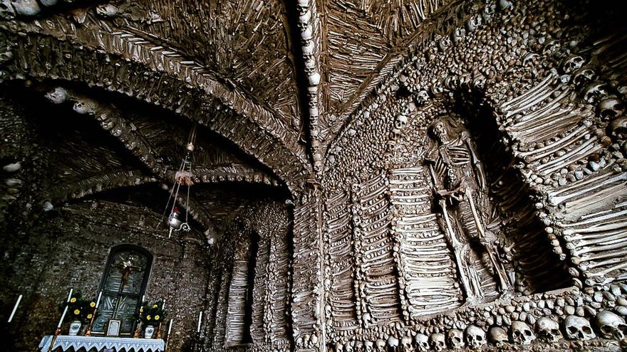 Calaveras y huesos tapizan las paredes de la Capilla de los Huesos de Évora, en Portugal.