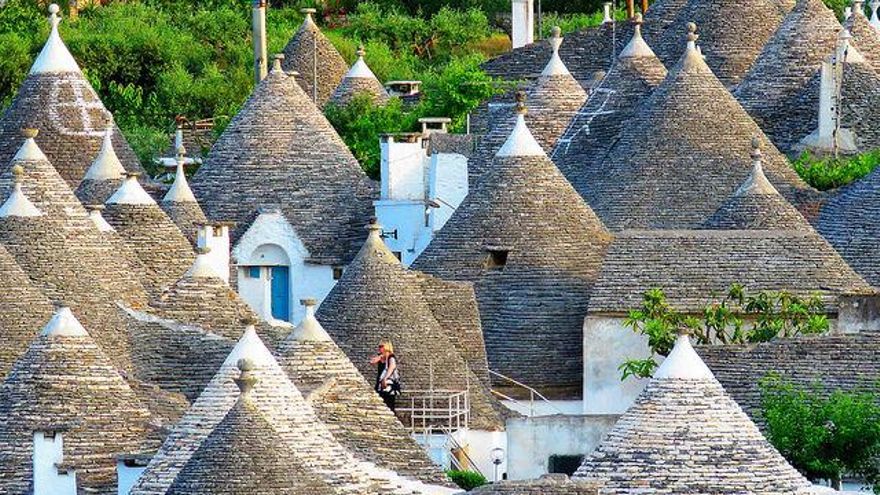 ALBEROBELLO .- Del pueblo de Alberobello son famosos los Trulli, construcciones de piedra con el techo cónico que forman vistosos conjuntos arquitectónicos. Los Trullo, conjunto de estas construcciones que forman grandes espacios habitacionales, han sido restaurados y habilitados y hoy la mayoría de ellos se han destinado a alojamientos turísticos. Aún así el paisaje de Alberobello es una de las más gratas sorpresas de la región y, junto a Matera y Lecce, las grandes atracciones de la misma. Pintados de riguroso blanco y con extraños símbolos mágicos en sus cúspides, estos domos (trulli viene del griego tholos o cúpula) forman parte del catálogo del Patrimonio de la Humanidad de la Unesco. Este modelo de construcción se repite en otros pueblos del Valle de Itria aunque es en Alberobello dónde se encuentra la concentración más importante. Muy cerca de aquí están las Cuevas de Castellana.