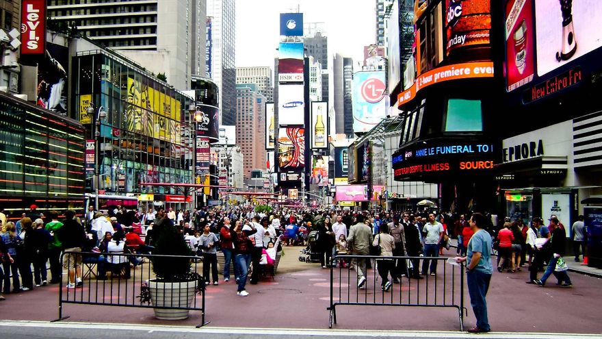 17.00 Por Broadway hasta Times Square y, de ahí, al cielo.- Dedicar la tarde a pasear entre las carteleras de los famosos teatros de Broadway no es mala idea para despejar la cabeza después de un par de horas en el MoMA. Basta con caminar dos cuadras hacia el oeste y cruzar 7th Avenue. Apenas 600 metros separan la intersección de Broadway y la calle 53 de la céntrica Times Square (Subway: Times Square; Líneas 1, 2, 3, 7, N, Q, R y W) corazón de Midtown y una de las imágenes recurrentes de la gran manzana. Enormes pantallas luminosas provocan una verdadera sobredosis de información que tiene en la publicidad su razón de ser. En pocos lugares como éste podemos experimentar que estamos en el centro del capitalismo universal.