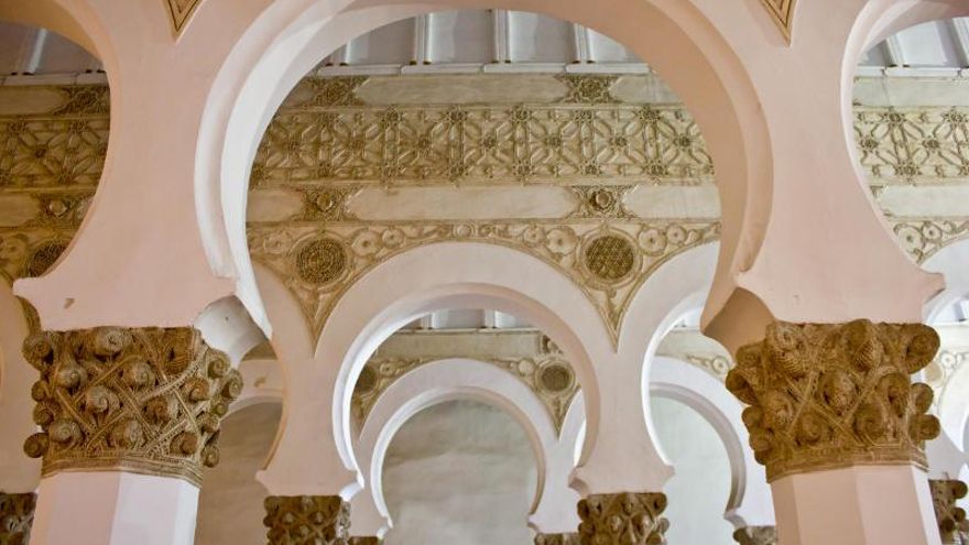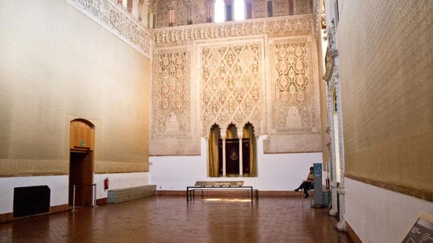 Suele pasar. Santa María la Blanca (Dirección: C/ Reyes Católicos, 4: Tel: (+34) 925 277 257; Horario: Del 1 de mayo al 31 de octubre L-D 10.00-18.45 y del 1 de noviembre al 30 de abril L-D 10.00-17.45.) se salvó del pico y la pala porque inmediatamente de dejar de ser sinagoga se convirtió en iglesia. Y a Dios gracias, porque es uno de los edificios más hermosos de la Europa medieval. Aunque una de las vigas marca el año de 1180, el edificio actual es algo más reciente. Un incendio destruyó el templo original, lo que obligó a reedificarlo en el siglo XIII. Una de las señas de identidad de Santa María la Blanca es la sencillez y belleza de su interior. La sala de oraciones cuenta con cinco naves separadas por arcos de herradura de ladrillo cubiertos de estuco blanco. Los capiteles de las columnas, como sucede en su homóloga segoviana, cuentan con decoración vegetal y las tradicionales piñas. Otro de los elementos destacables de esta construcción es la decoración geométrica de sus simples pero notables yeserías. Como particularidad, el templo no cuenta con galería de mujeres.
