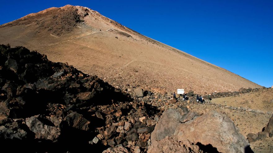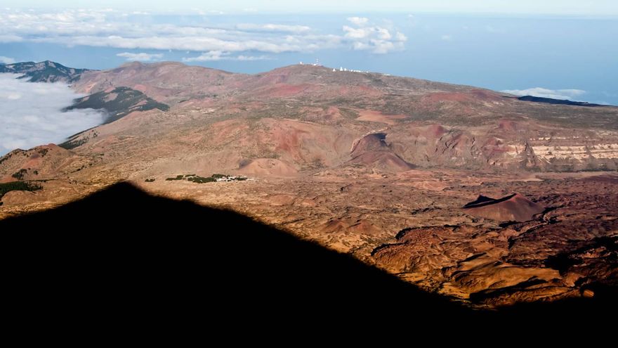Mientras subimos hasta la Cueva del Hielo nos cruzamos con los que han optado por subir hasta aquí a través del Teleférico. No es mala opción para los que no se vean con las fuerzas de subir desde las faldas del volcán. Pero conviene hacerlo a media tarde para disfrutar del espectáculo que ofrece la sombra de la enorme montaña que avanza por las Cañadas del Teide hasta escaparse de la isla y proyectarse sobre el mar. A la sombra hace frío. Y cuando el sol termina por esconderse el mercurio del termómetro se desploma y el frío se adueña del escenario aún en pleno verano. Eso sí, el espectáculo que ofrecen los cielos despejados cuajados de estrellas y las luces de las islas vecinas merece la pena. Hay que irse a dormir pronto. A las 5.00 de la mañana la actividad dentro de las habitaciones se volverá febril.