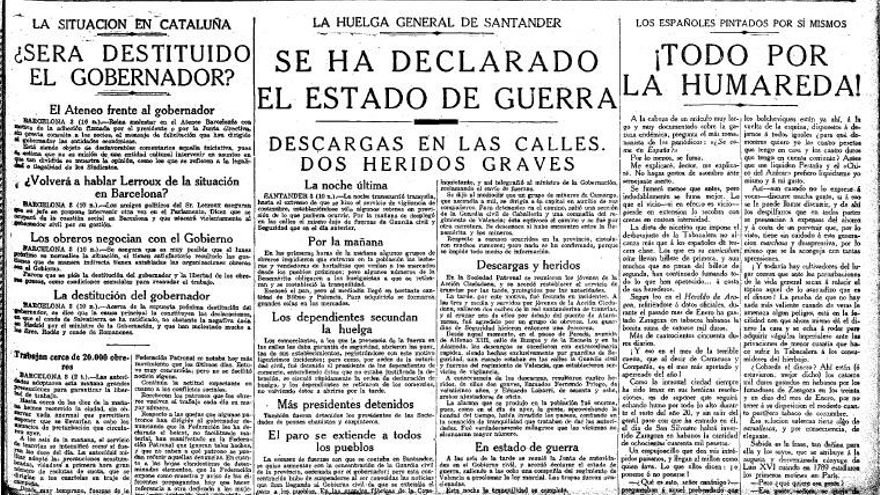 Desde las primeras horas de la madrugada del lunes grupos de obreros se desplazaron a las proximidades de fábricas y talleres para informar de la convocatoria. Del éxito del mismo da cuenta que los concejales santanderinos aseguraban, según El Cantábrico , “que el paro era el más unánime que se había visto en Santander desde hacía muchos años, y el que encerraba mayor gravedad, por el mismo motivo”. El día trascurrió sin incidentes, la apariencia de la ciudad era la de un día festivo “el aspecto de la población, con los establecimientos cafés y comercios cerrados, sin carruajes ni tranvías, a pesar del enorme gentío que se veía por todas partes, daba aspecto de tristeza”. Las autoridades dispusieron diferentes medidas: el gobernador civil ordenó la clausura del Centro Obrero y solicitó la ayuda de instituciones y fuerzas vivas para restablecer la normalidad. Fuerzas del Ejercito custodiarían instalaciones críticas como las fábricas de gas, electricidad y depósitos de agua. El gobernador militar, Eduardo Castell, reclamó a la Capitanía General el envío de un escuadrón de caballería y se reconcentró a la Guardia Civil. El alcalde intentó mantener el funcionamiento de los servicios públicos y asegurar el abastecimiento de productos básicos, para lo cual pidió la colaboración del Club Automovilista.
