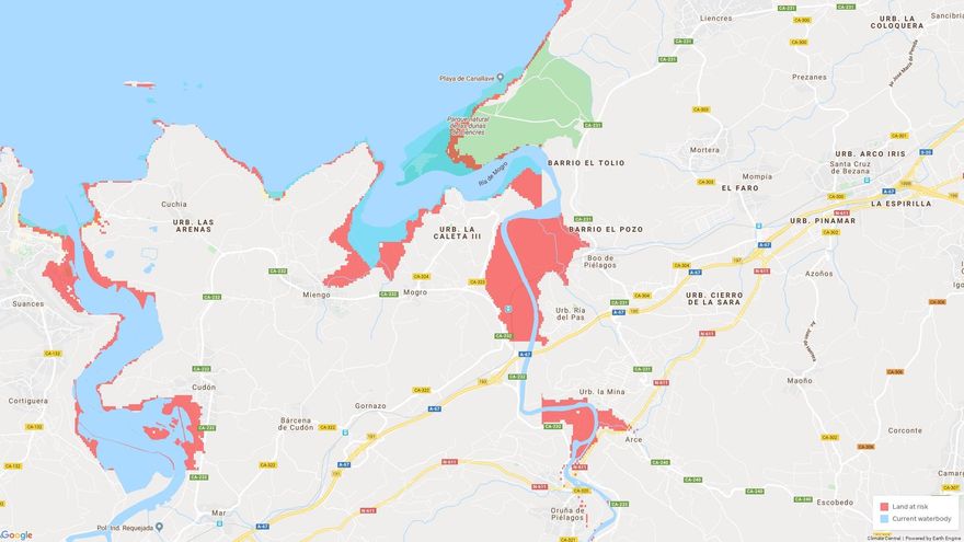 En las proximidades, otra zona en riesgo es Suances, en las proximidades de la desembocadura de la ría, y afectando amplias franjas de Cudón y Cuchía.