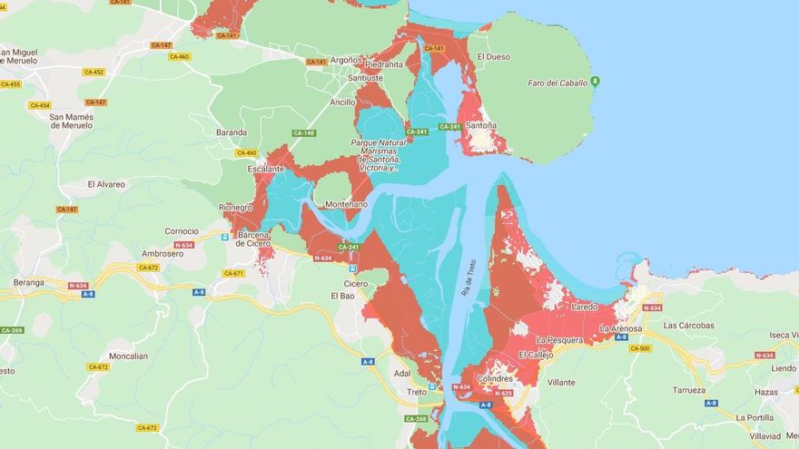 El istmo que une Santoña con Argoños, en donde está enclavado también El Dueso y el Faro del Caballo, desaparecerá. Las zonas de riesgo por inundación afectan al Parque Natural de las Marismas de Santoña, Victoria y Joyel, el entorno de Montehano, Cicero, Colindres y Laredo. Especial mención merece la desaparición de El Puntal de Laredo. No muy lejos de allí, Oriñón y toda la desembocadura del río Agüera están en zona roja.