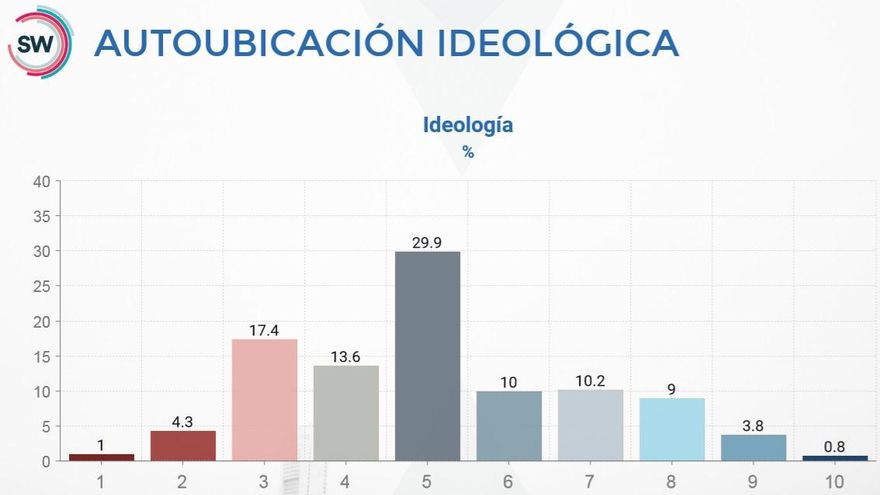En concreto, en una escala en la que el 1 es la extrema izquierda y el 10 es la extrema derecha, 29,9% de los encuestados eligen el 5, seguido por el 17,4% que se coloca en el 3 y un 13,6% en el 4. En el espectro de la derecha, los porcentajes están más igualados, y solo un 0,8% elige el 10.