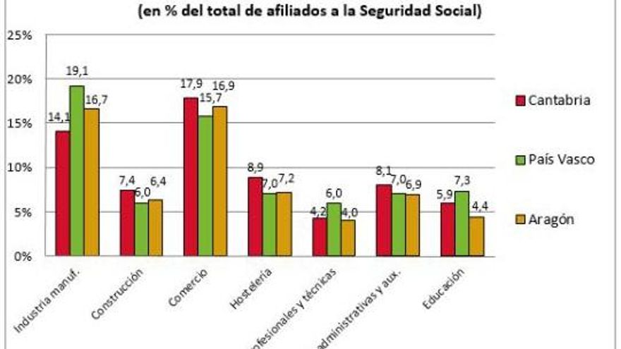 El gráfico 2 describe el peso que tienen, en Cantabria, el País Vasco y Aragón, varios sectores económicos de especial interés, a partir de la afiliación a la Seguridad Social de diciembre de 2015. Del análisis comparativo se desprenden cuatro elementos clave: