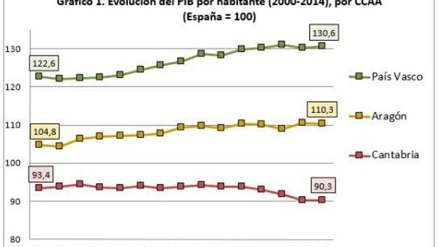 Por ello, tomo como modelo de referencia para Cantabria aquellas regiones que reúnan tres características: 1. Un mayor nivel económico que la media nacional; 2. Una mejor evolución en los últimos años; y 3. Que lo hayan conseguido aumentando también la población y el empleo. Solo hay tres comunidades autónomas que cumplen simultáneamente esas tres condiciones: Madrid (un caso particular que se beneficia mucho de ser la capital, atrayendo empresas y trabajadores cualificados), el País Vasco y Aragón. En lo que llevamos de siglo, mientras Cantabria ha perdido 3 puntos respecto a la media estatal en su PIB por habitante, el País Vasco ha ganado 8 puntos, consolidando un liderazgo económico que ya tenía inicialmente; Aragón, por su parte, situado ligeramente por encima del promedio nacional al inicio, ha ganado otros 5,5 puntos respecto al mismo en estos años.