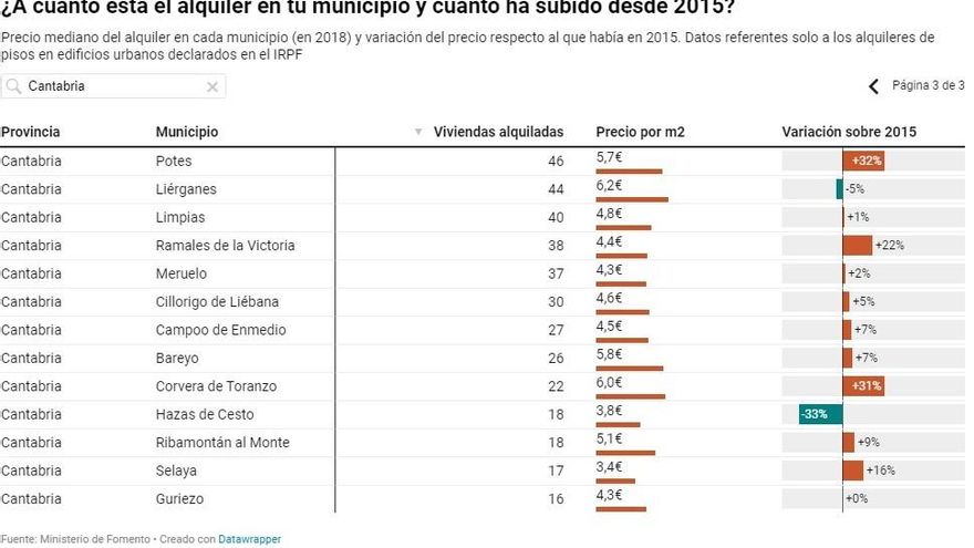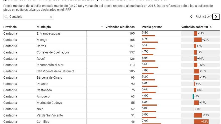 El precio de la vivienda en alquiler se ha disparado desde 2015 como consecuencia de la presión turística en la zona costera, la crisis económica de 2008 y la búsqueda de inversiones-refugio para los inversores tras el estallido de la la burbuja del ladrillo. Comillas, con un 52% de incremento del precio de los alquileres, es el mejor exponente de los municipios turísticos en donde alquilar es cada vez más difícil, mientras que Santander y Torrelavega no se han escapado de la escalada de precios, con un 11 y un 8%, respectivamente, entre 2015 y 2018, como consecuencia del mayor atractivo que para propietarios e inversores tiene el arrendamiento de pisos.