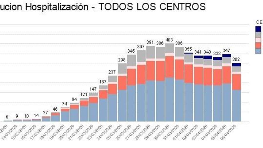 De total de las 302 personas hospitalizadas, 165 se encuentran en el Hospital Universitario Marqués de Valdecilla (31 en la Unidad de Cuidados Intensivos); 18 en el Hospital de Liencres; 79 en el Hospital Comarcal de Sierrallana (9 en la Unidad de Reanimación y Cuidados Críticos); 27 en el Hospital de Laredo y 13 en el Hospital Tres Mares.