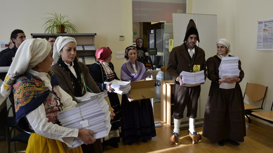 Las firmas han sido entregadas en la Delegación del Gobierno por un grupo de personas de la Asamblea ataviadas con trajes típicos de las comarcas afectadas. Además, un miembro del colectivo se ha disfrazado de la muerte para alertar de los peligros del 'fracking' sobre el medio ambiente y la salud.