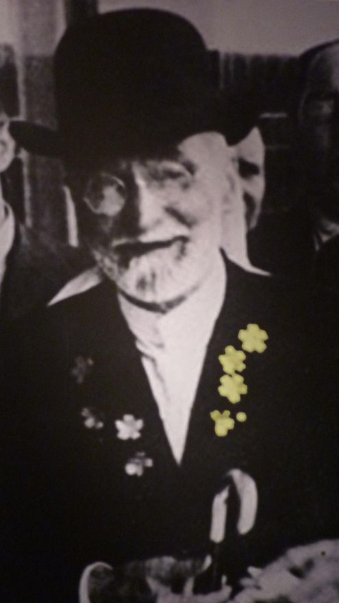 Pelayo es la imagen de esta exposición en una foto en blanco y negro en la que destacan unas flores coloreadas en amarillo. Es el necesario puente entre el pasado y el presente. La visita del marqués coincidió con la extinta Fiesta de la Flor y en la imagen sonríe adornado con unas mimosas de las que hoy aún flanquean la entrada del Pabellón de Anatomía Patológica del Hospital.
