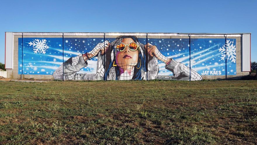 El proyecto se llama Galería Vertical, la chica encargada de ello es Almudena Báscones, y me he dado cuenta de que justo aquí, en este pueblo, la mayoría de los murales son de mujeres, pero bueno, supongo que sea casualidad, aunque me ha llamado la atención. El proyecto es muy interesante porque están intentando renovar la ciudad. Me gusta participar en estos experimentos de dar color y vida a una ciudad y es un trabajo guay, pero a veces es duro porque acabas en mitad de la nada pintando una movida solo o con dos personas, pero aun así mola.