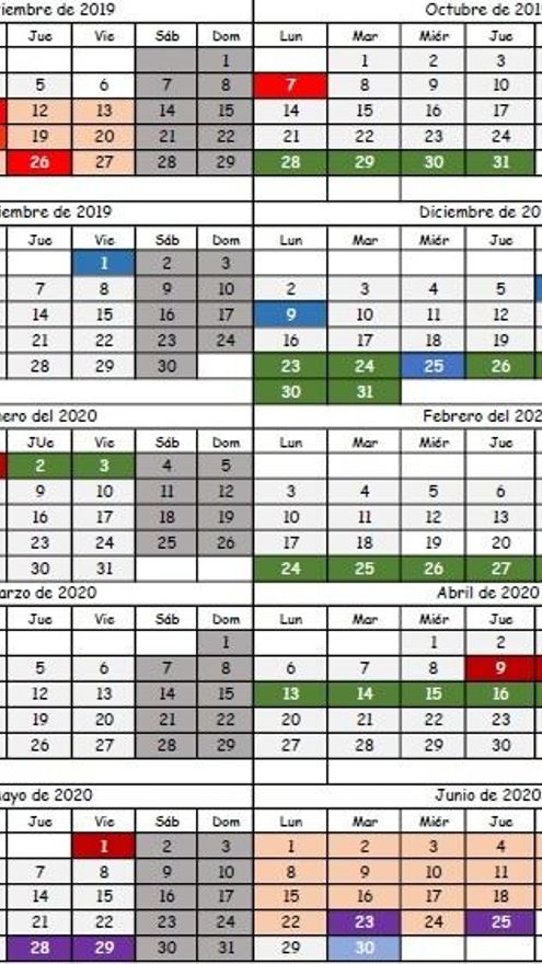 No serán días lectivos los siguientes días: 28, 29, 30 y 31 de octubre; 23, 24, 26, 27, 30 y 31 de diciembre; 2, 3 y 7 de enero de 2020; 24, 25, 26, 27 y 28 de febrero; y 13, 14, 15, 16 y 17 de abril. Los días 1 y 6 de enero, 9 y 10 de abril y 1 de mayo de 2020, en caso de no ser declarados oficialmente festivos, serán días no lectivos.