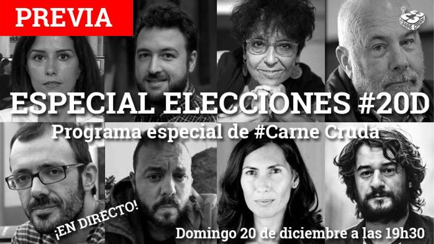 El domingo 20D, tenemos programa, programa, programa para hablar de política en serio y en broma. A partir de las 19:30 conoceremos los resultados electorales en un programa especial con periodistas como Ramón Lobo, Olga Rodríguez, Isaac Rosa, Maruja Torres, Antonio Maestre, Marisa Gallero y Enric González. Conectaremos Juan Luis Sánchez y nuestros compañeros de eldiario.es en las sedes de los partidos.