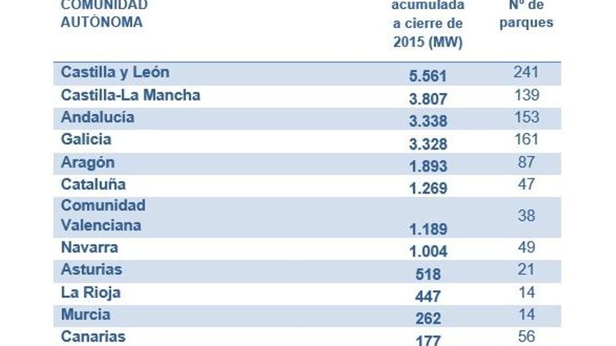 Los datos a cierre de 2015 aportados por la Asociación Empresarial Eólica son irrefutables: en los dos últimos años no se ha instalado en Castilla-La Mancha ni un solo megavatio de energía eólica. En el caso del ejercicio pasado, la tendencia ha sido la misma que en España. El dato resulta significativo si se tiene en cuenta que Castilla-La Mancha, según el mapa eólico que actualiza esta asociación de forma regular, la potencia acumulada hasta el último mes de diciembre fue de 3.807 megavatios en un total de 139 parques eólicos, ocupando la segunda posición después de Castilla y León, con 241 instalaciones y 5.561 megavatios.