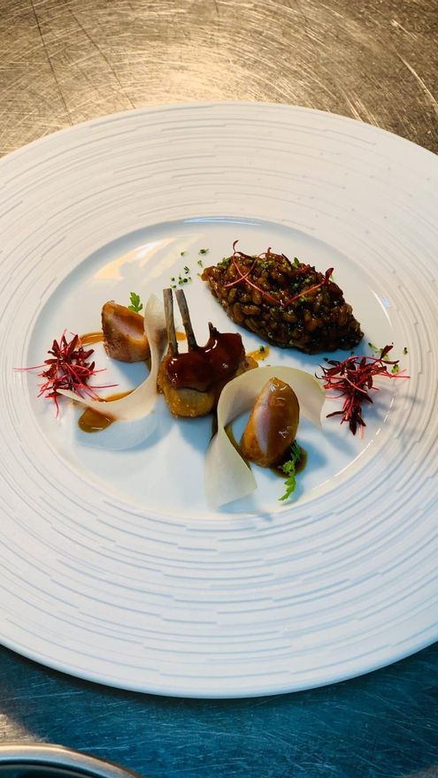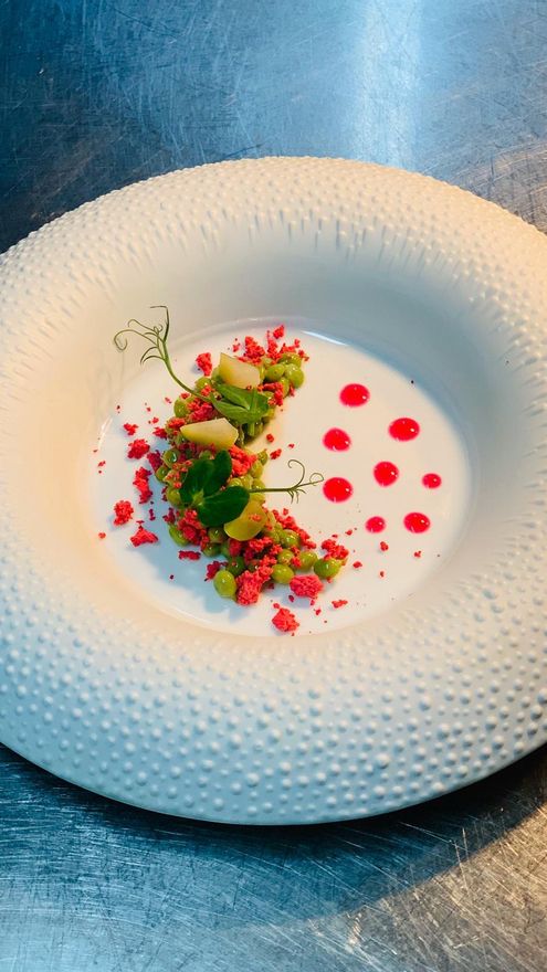 Actualmente, el plato del que más orgulloso se siente es una elaboración con “lubina que lleva una picada de puerro, tomate y jengibre, aliñada como una ensalada, aceite, sal y vinagre, una holandesa clásica con un toque a carabinero, matices de hinojo y apio, brotes tiernos y unas hojas fritas de berza y pulpo; su caldo de espinas, que es lo que le da el toque a ese mar intenso que te acompaña y da contrastes de sabores”, detalla.