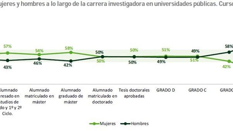 Es un problema al que luego se añade -o se complementa con- el denominado “techo de cristal” o la imposibilidad de muchas mujeres de acceder a los mayores rangos profesionales. “Incluso aquellas que no tienen ese problema de autoimagen y terminan accediendo sin sesgo se encuentran con este problema”. Desgrana en este caso el conocido como “gráfico en tijera” donde en los escalones superiores empieza a bajar el porcentaje de mujeres. Por ejemplo, en la categoría de catedrático de universidad o de investigador del CSIC, hay un 75% de hombres y un 25% de mujeres.