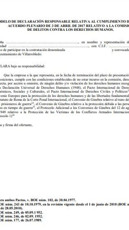 Este martes el Pleno de, Villarrobledo ha aprobado la propuesta del PSOE para anular “los acuerdos de apoyo al Pueblo Palestino”. Tal y como ha explicado a esta redacción el concejal de Se Puede Villarrobledo, Mario de la Ossa, han sido los votos favorables de PSOE y Partido Popular los que han permitido aprobar esta propuesta que deja elimina la “declaración responsable” que desde hace algo más de año y medio se había exigido firmar a las empresas que contratan con el consistorio.